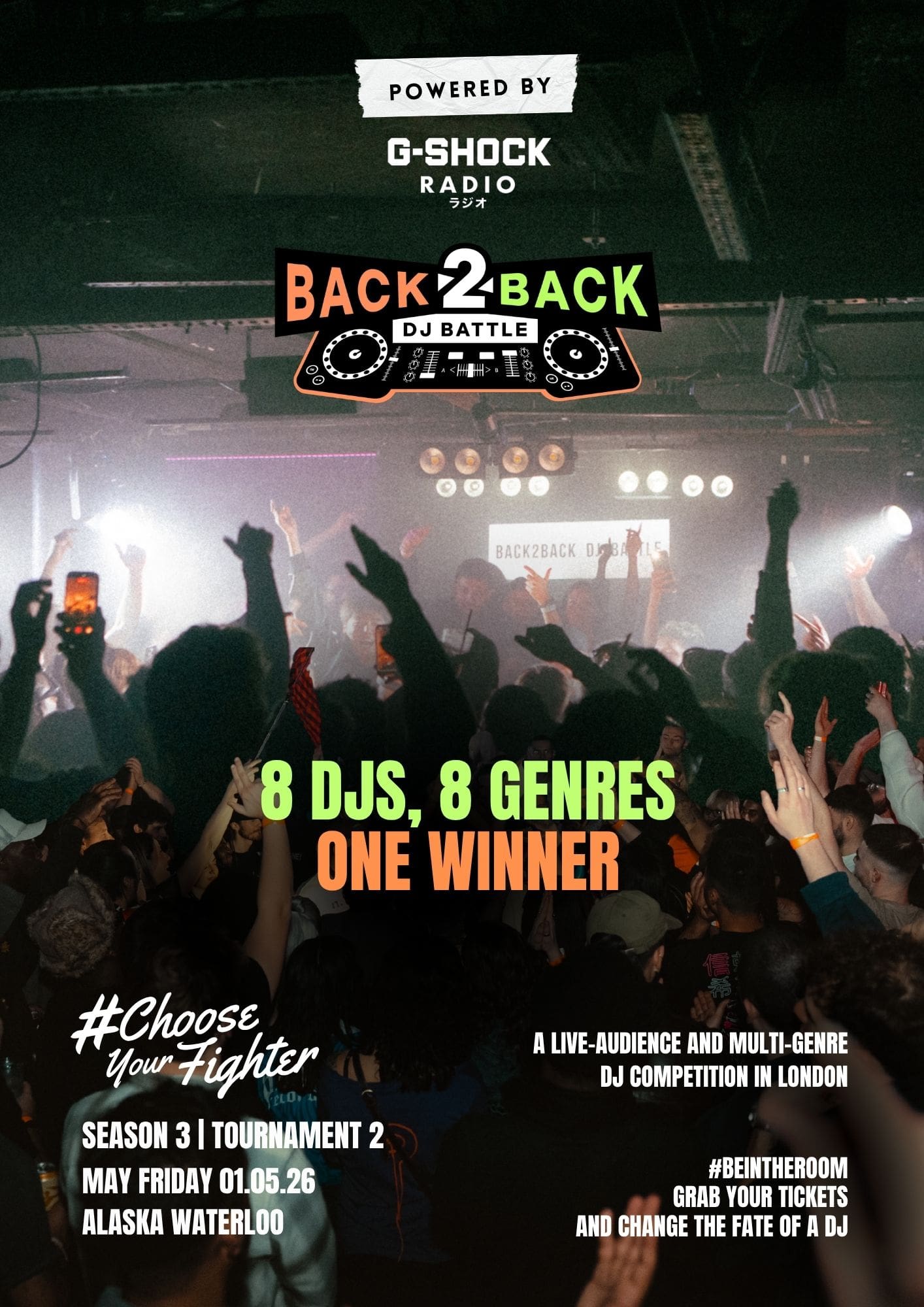 Powered by G-SHOCK Radio - The Back2Back DJ Battle is a multi-genre music event & DJ competition. 8 DJs representing diverse sounds and styles, are chosen as part of this artist development program all leading up to this one night to go head to head. Taking place LIVE in front of an audience and panel of judges who all have the power to take DJs into the next round. You can change the fate of a DJ and accelerate their careers as screams are votes! The winner gets a hamper of prizes from Alpha Theta (Pioneer), Mixcloud, Pirate Studios, Noise, The Faded Scene publication and more!