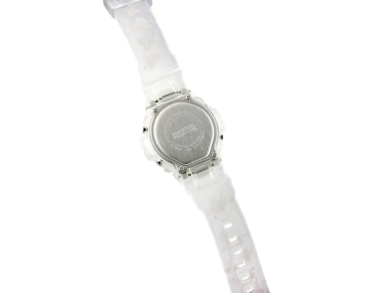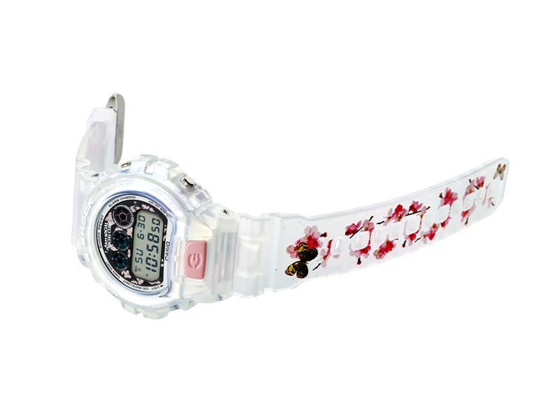 The DW6900ASSC25-7 sports a clear resin with a pearlescent finish that's adorned with ASSC's iconic cherry bossom design. The cherry blossom theme is also applied on the dial.