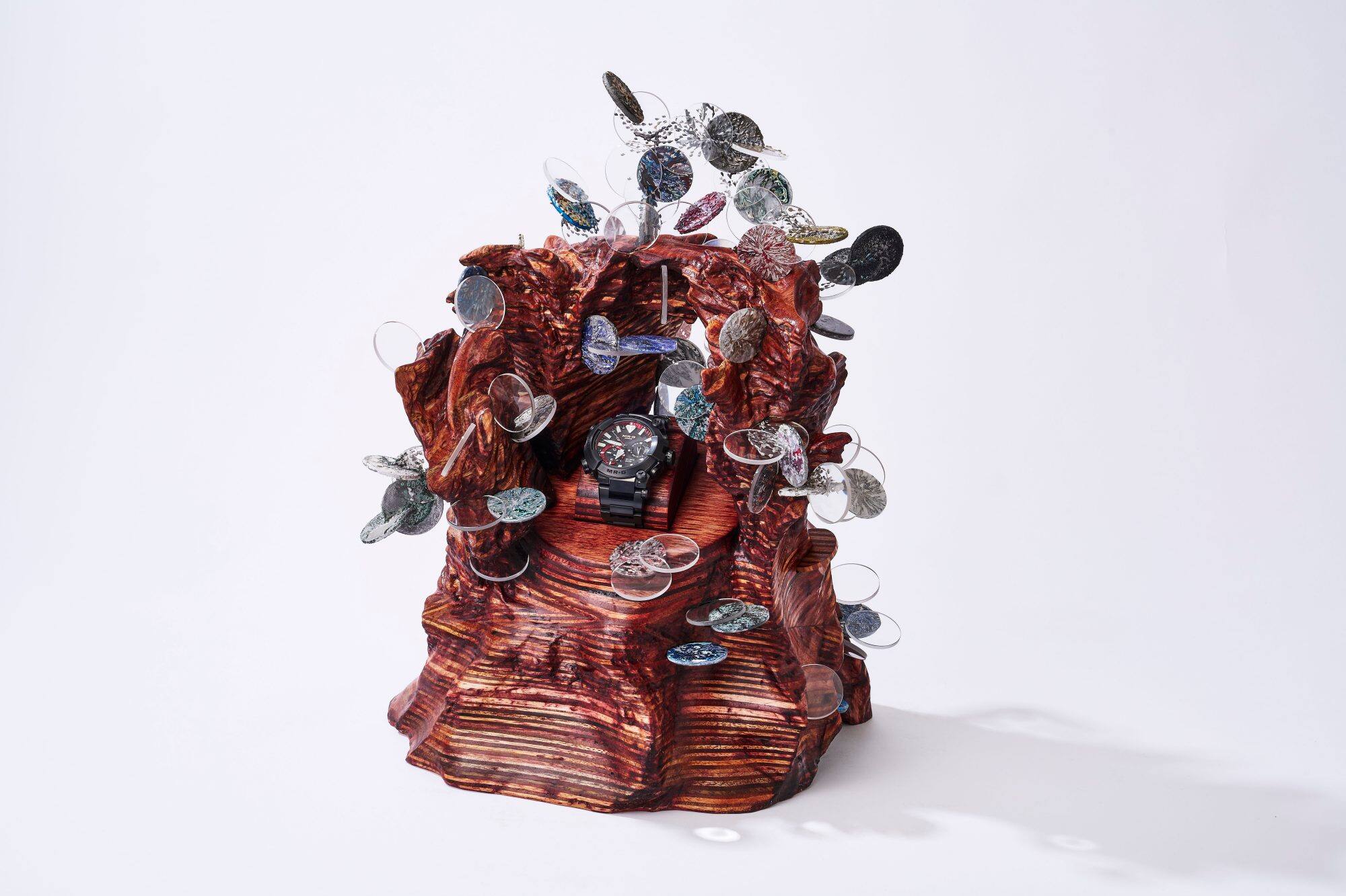 Around the completed pedestal are circular discs with the same specs used for the watch, made of materials including wood and the sapphire crystal used for MR-G timepieces.