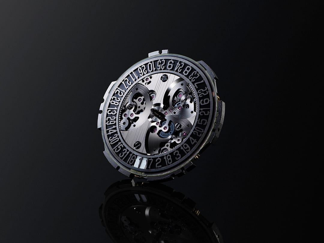 Kết hợp các thành phần giảm xóc ở dạng hữu cơ, mặt đồng hồ có thiết kế trong suốt, không có mặt số giúp cơ chế bên trong hiển thị rõ ràng. Được thiết kế đặc biệt chỉ cho riêng mẫu này, bộ chuyển động sử dụng một tấm kim loại chính, bánh răng silicon và vòng bi hồng ngọc để giúp kim quay với độ chính xác cao hơn. Pin mặt trời, có lớp tạo năng lượng được làm từ hợp chất gali, sử dụng một hệ thống áp dụng công nghệ pin mặt trời thường được sử dụng trong các vệ tinh. Tận dụng chuyên môn do ngành công nghiệp vũ trụ phát triển, hệ thống này nâng cao đáng kể hiệu quả tạo năng lượng so với pin mặt trời truyền thống. Hệ thống này khai thác ánh sáng xuyên qua một khe nhỏ trên màn hình hiển thị ngày để cung cấp năng lượng đáng tin cậy cho các chức năng khác nhau, bao gồm cả khả năng thu sóng vô tuyến thời gian tiêu chuẩn.