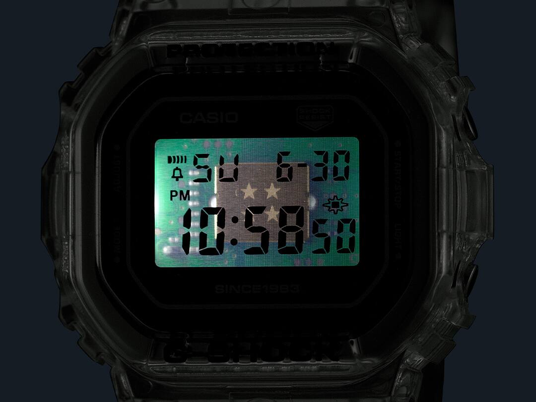 Vật liệu trong suốt được sử dụng cho màn hình LCD để hiển thị bảng mạch bên dưới. Trên bảng mạch được phát triển độc quyền, nắp LSI kim loại phủ lớp mạ ion màu vàng và được khắc bốn ngôi sao để kỷ niệm bốn thập niên G-SHOCK ra đời. Cùng với dấu G và logo G-SHOCK tô điểm cho bảng mạch, các đặc điểm thiết kế này mang đến cảm giác vui nhộn có thể nhìn thấy từ bên ngoài. Thiết kế mới lạ này đạt được nhờ sử dụng đèn nền LED và tấm dẫn sáng trong suốt.