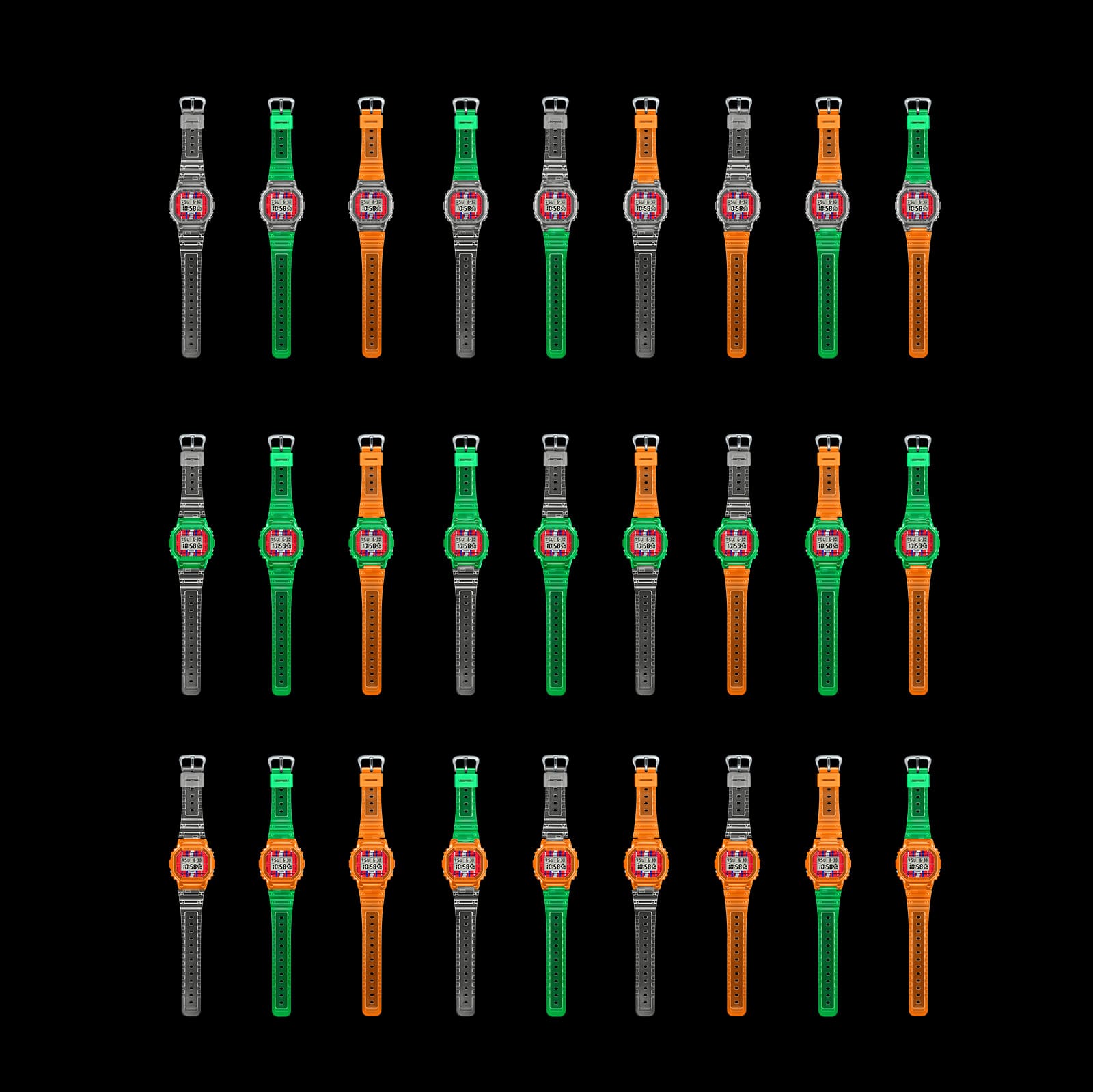 bằng cách thay đổi dây đeo và đường gờ, làm từ vật liệu trong mờ màu trong, cam và xanh lục