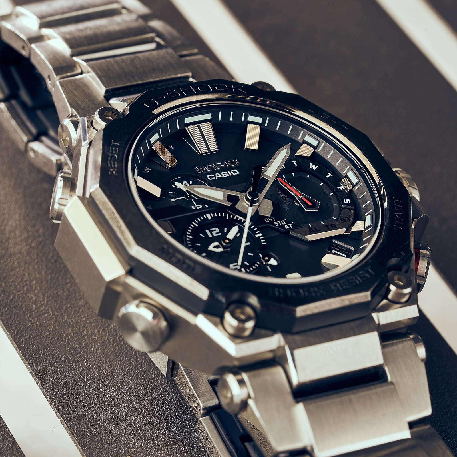 In response, CASIO used fine cutting technology to create a master model that would serve as the basis for the mold. By using electroforming technology to laminate metal onto the master model, CASIO was able to create a mold that was more faithful to the original model, enabling mass production of a sharp form that looked like a direct copy of the master model. In addition, the edges of the gently curved index surface, the beautiful mirror surface, and the luster of the fan-shaped cut surface on the outer circumference of the dial would not have been possible without nano-processing technology. Even though plastic parts are used to prevent the watch from falling off or being damaged by impact, they are given a shine and a sense of weight that could be mistaken for metal, completing a look that is worthy of MR-G, the pinnacle of the G-SHOCK line.